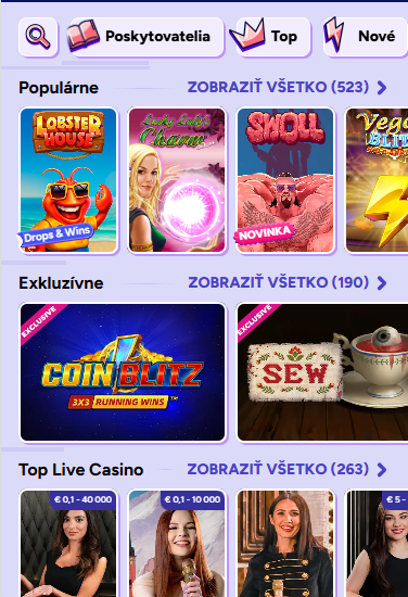 - Filtre Top/Nové/Populárne, Bonus Buy, Megaways, okamžité hry.