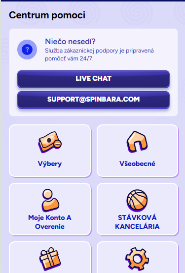 | Zákaznícka podpora | Live Chat 24/7, e-mail: support@spinbara.com |